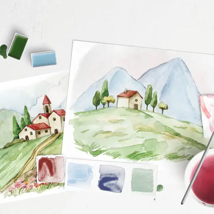 Paint your own watercolor Italian fields with these outlines and paints. This kit is compact and portable- everything packaged together in a tin painting box. Just add water to the included water brush and you can paint anywhere! I T E M • 4 different painting outlines on watercolor paper • 6×3.5 inch size • packaged in a tin painting box • water paintbrush • watercolor paints and color guid